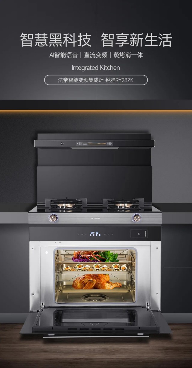 法帝集成灶將廚房中常見的油煙機、燃氣灶、蒸箱、烤箱、保潔柜等功能規(guī)整在一起,1臺頂N臺,減少了廚電占地空間,讓整個廚房在視覺上顯得通透明亮,增添清涼感。