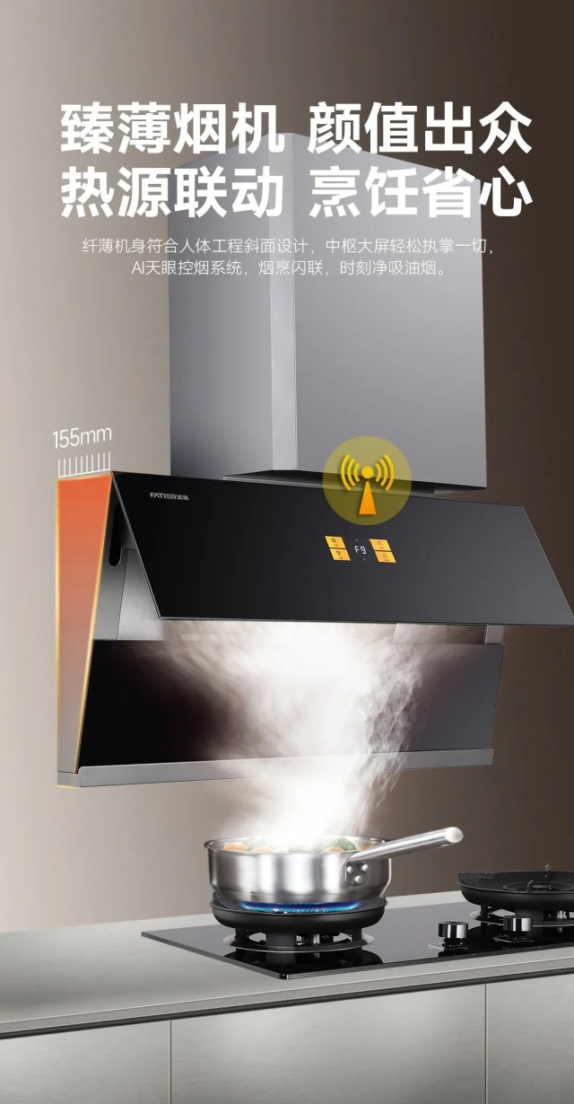 超薄吸油煙機,寬域鎖煙,杜絕油煙逃逸。配置直流變頻風機,NVH多維柔聲科技超凈吸,智能巡航增壓實時感應風阻,自適風量檔位為烹飪保駕護航,油煙強勢暢排不倒灌。吸凈+暢排+防倒灌三管齊下,還廚房一方清新!