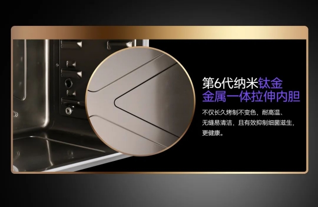 并將第6代納米鈦金科技運用于集成灶內膽中,無懼刮傷、刮花,長久烤制不變色,同時鈦金元素具有強斥油性、強抗腐蝕性,一體拉伸成型內腔無縫隙,不會出現油污、食物殘留,餐后清潔難度大幅降低。