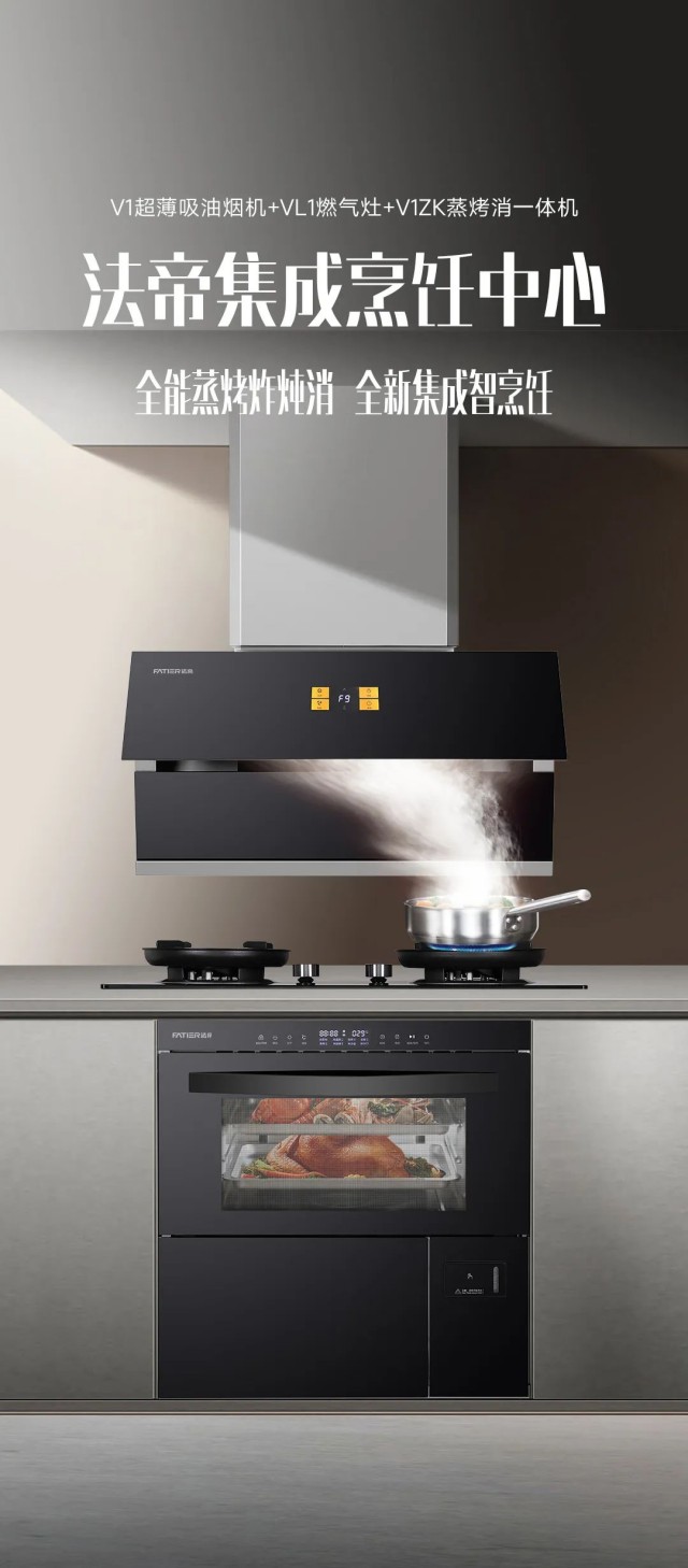 法帝集成烹飪中心,包含煙機、灶具、蒸箱、烤箱、保潔柜,比傳統(tǒng)廚電功能更全面,滿足中國家庭更多烹飪需求。