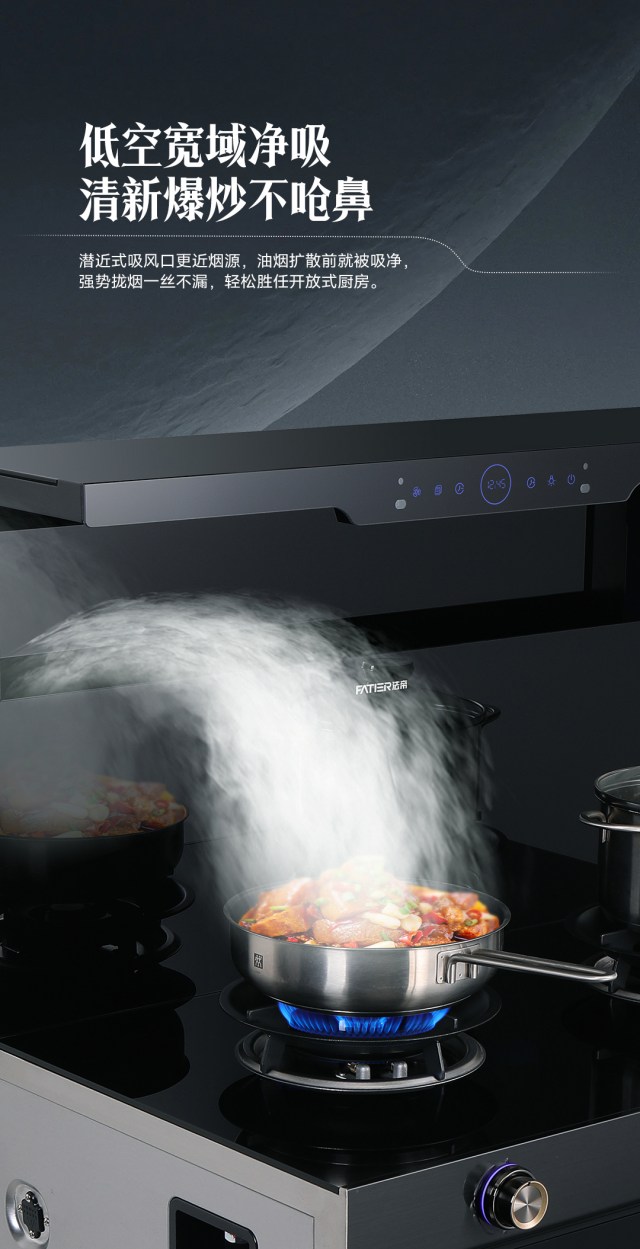 法帝集成灶以無煙廚房為使命,一直追求高標準、高難度的凈煙挑戰。法帝新品X5系列集成灶采用了潛近式吸風口,通過源點低吸,寬幅攏煙,煙源更近,吸得更凈,從根源防止油煙擴散,強勁動力瞬吸油煙不撲臉,高效解決廚房油煙難題。