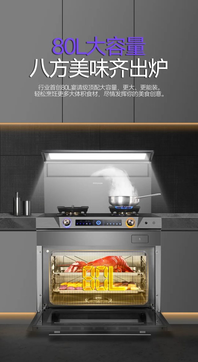 法帝星耀XL15ZK蒸烤一體變頻集成灶擁有80L大容量蒸烤箱,四層擱架設(shè)計(jì),滿足大食量的需要。十大智能烹飪模式集成一體,無(wú)論是蒸菜、燒烤、烘培還是發(fā)酵、空氣炸,都能一鍵搞定,上烹飪下蒸烤,多人家宴片刻即達(dá)。
